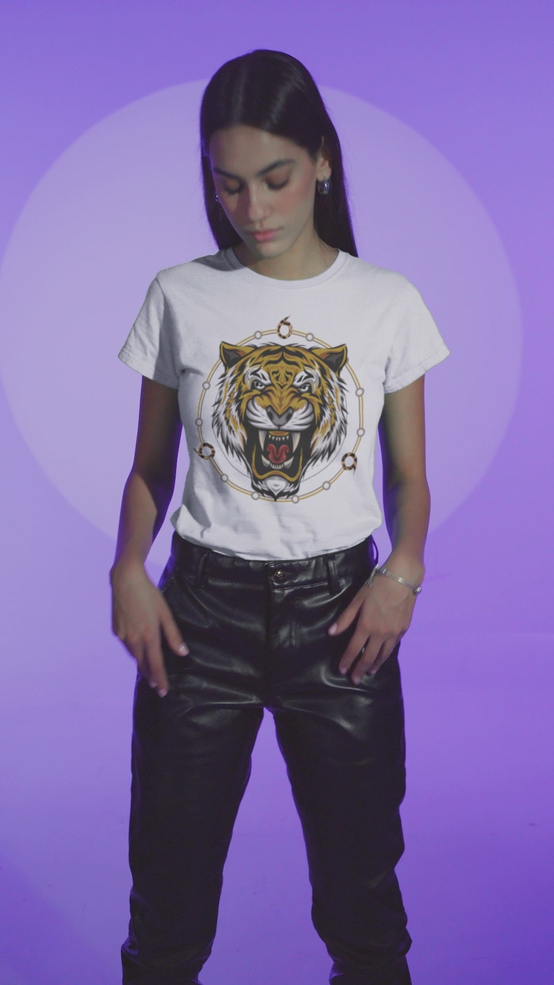 HYD T-Shirt Tsf Tiger Circle, White Manga Corta, T-Shirt Mujer Cuello Redondo Manga Corta , Diseño Animal Print 120Grs/M2, 100% Organic Cotton