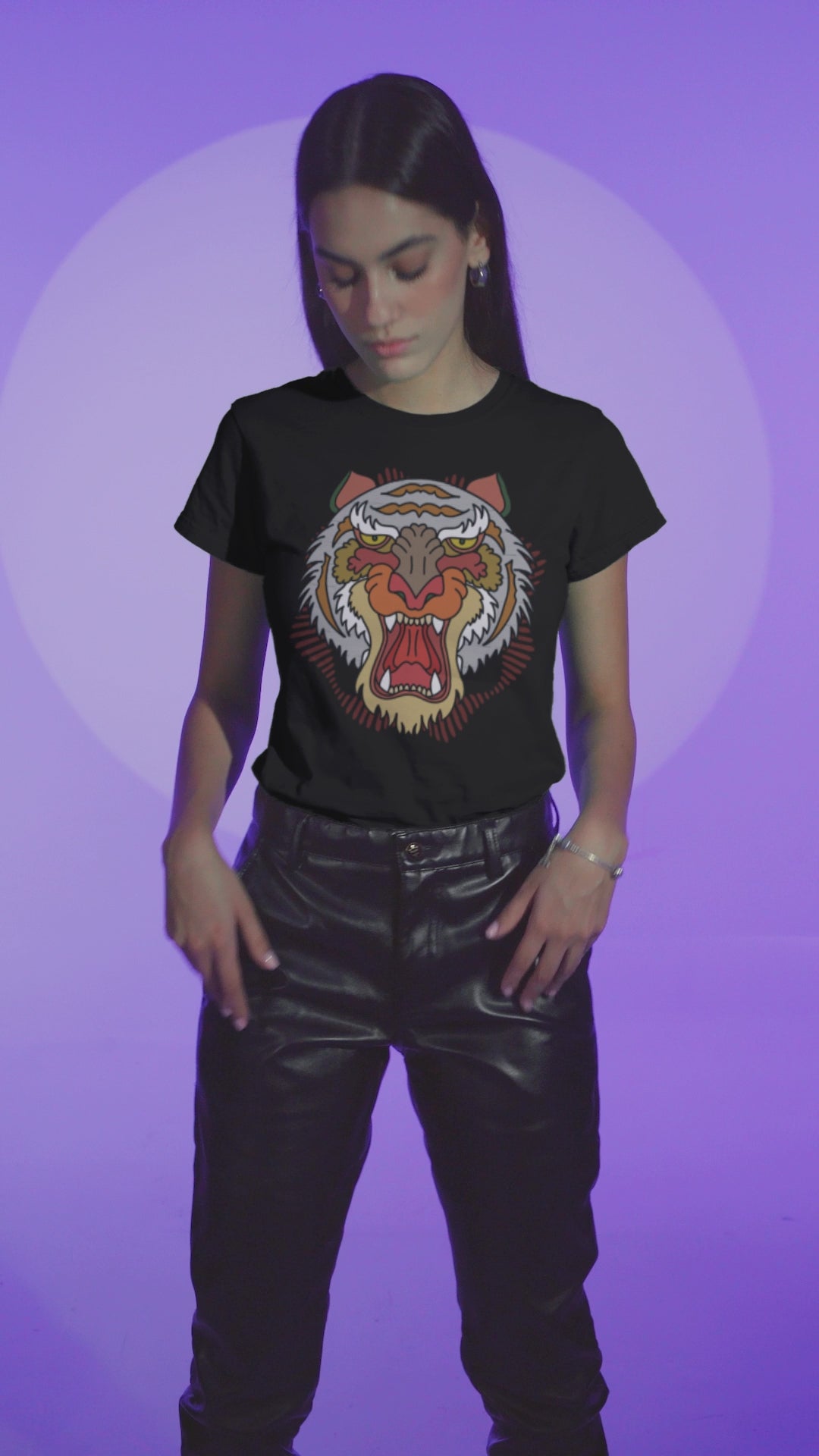 HYD T-Shirt Tsf Tiger Line, Black Manga Corta, T-Shirt Mujer Cuello Redondo Manga Corta , Diseño Animal Print 120Grs/M2, 100% Organic Cotton