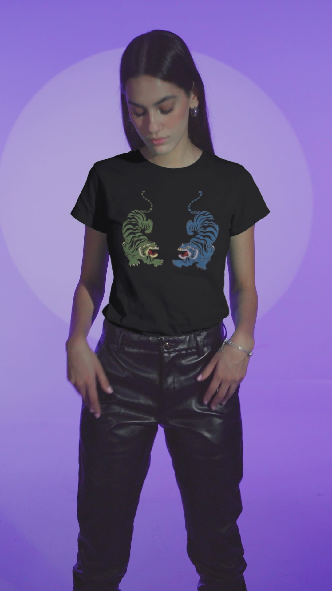 HYD T-Shirt Tsf Tiger TWo, Black Manga Corta, T-Shirt Mujer Cuello Redondo Manga Corta , Diseño Animal Print 100% Organic Cotton,