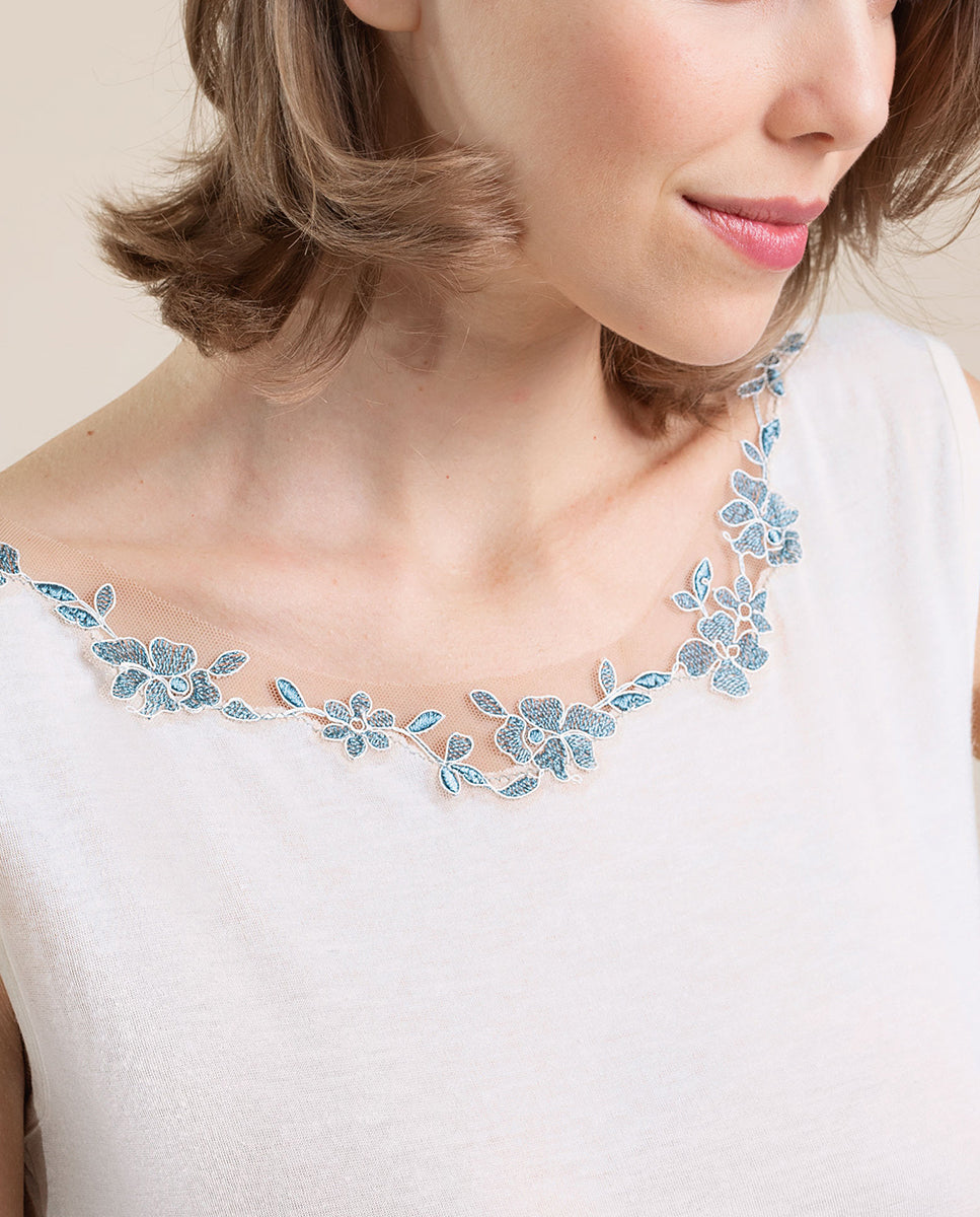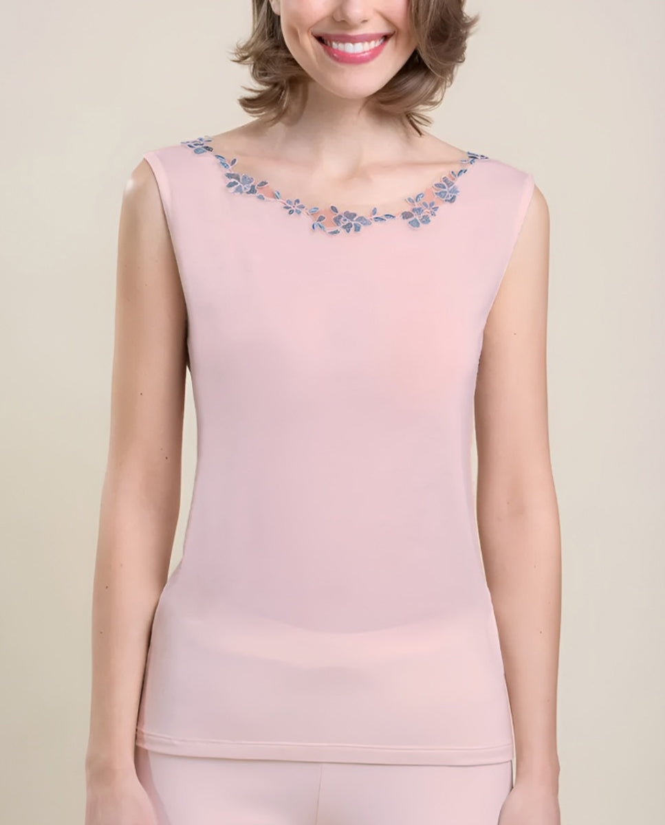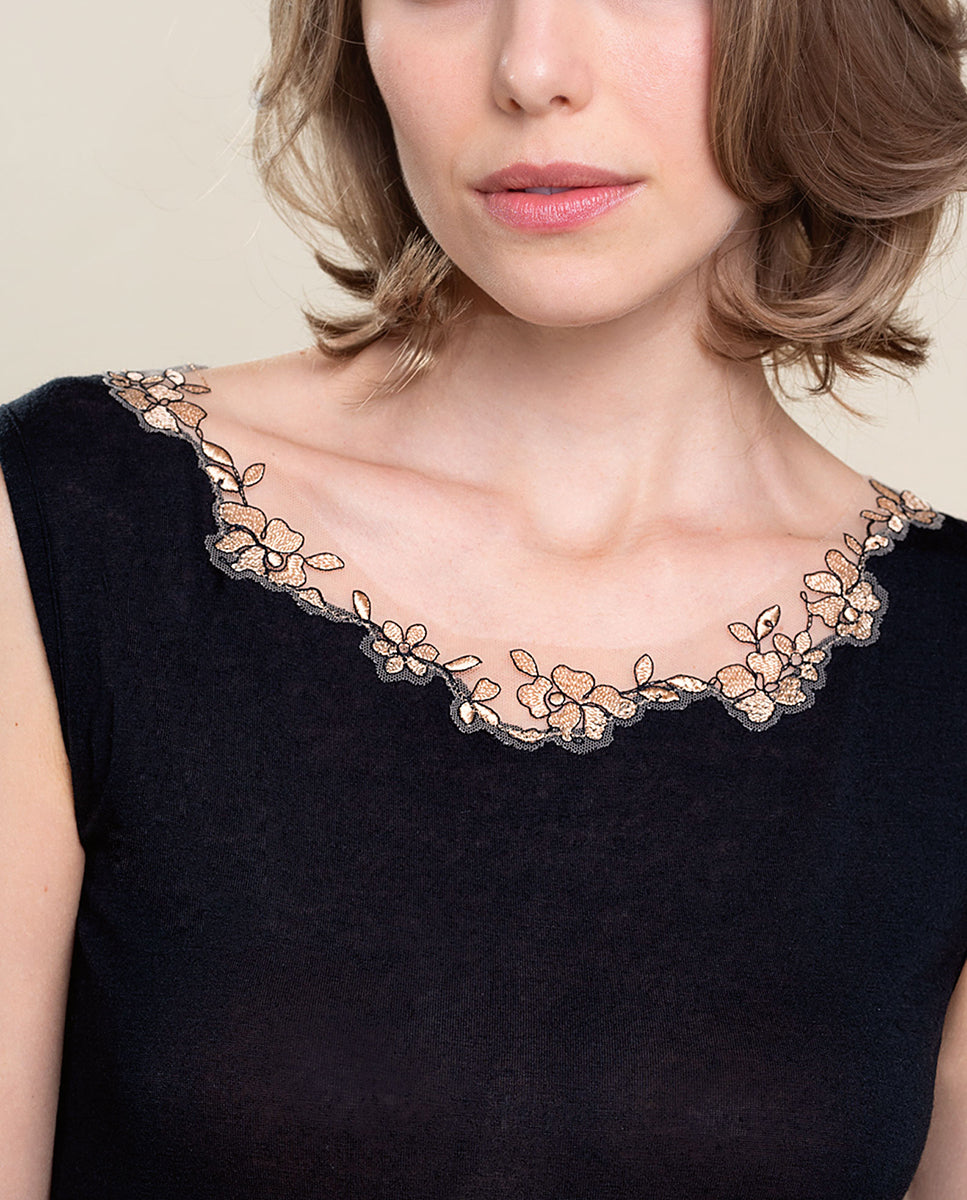 VITTORIA B. VI826 Camiseta Interior Modal, Camiseta Interior De Mujer Sin Mangas Con Tul Bordado Fantasía. 85 % Modal 9 % Cashmere 6 % Elastano