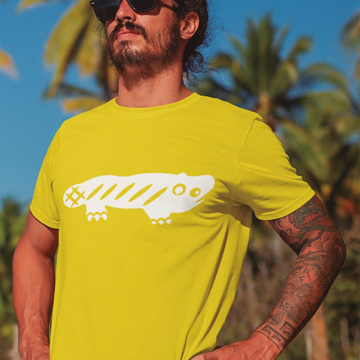AMARA-A BS01 - T Shirt Big Ajolote WHITE - SPECTRA YELLOW 100% 100% Organic Cotton, 150 g/m², Seamless, Set-in sleevess, regular fit, 1x1 ribbed collar, inner binding in main fabric at neck, wide double stitching on cuffs and hems, DTF logo