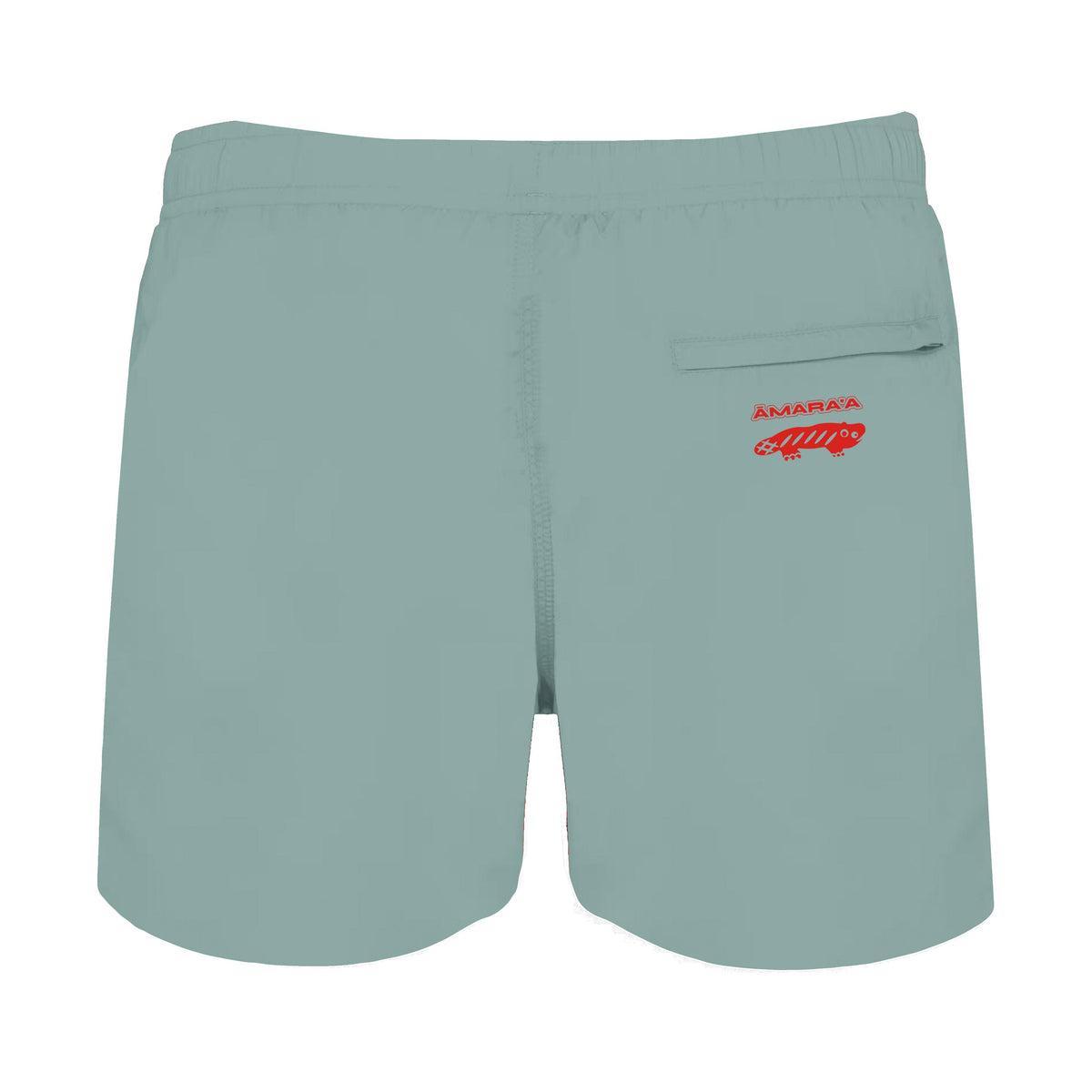 AMARA-A BS10 Mid-Length Wave Swim Trunks RED FLUO - SAGE 100% polyamide. Straight cut. 2 open side pockets with mesh lining, 60 g/m². Lightweight quick-dry fabric. Back pocket with zipper. Reinforced stitching on the pockets, inseam, hem, and waistband. DTF logo