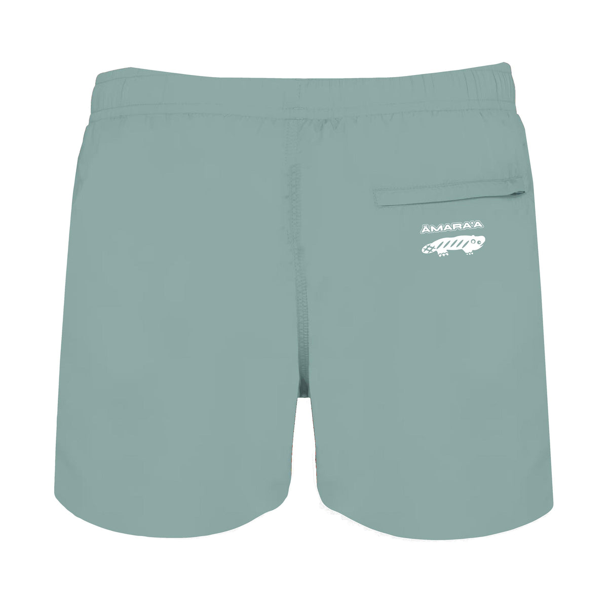 AMARA-A BS10 Mid-Length Wave Swim Trunks - WHITE SAGE 100% polyamide. Straight cut. 2 open side pockets with mesh lining, 60 g/m². Lightweight quick-dry fabric. Back pocket with zipper. Reinforced stitching on the pockets, inseam, hem, and waistband. DTF logo