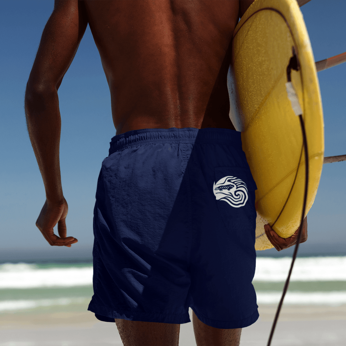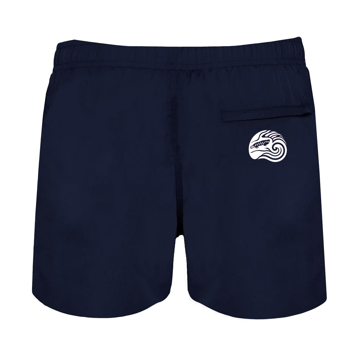 AMARA-A BS11 Small Ajolote + Text Swim Trunks WHITE - NAVY 100% polyamide. Straight cut. 2 open side pockets with mesh lining, 60 g/m², Lightweight quick-dry fabric. Back pocket with zipper, Reinforced stitching on the pockets, crotch, leg hems and back waistband. DTF logo