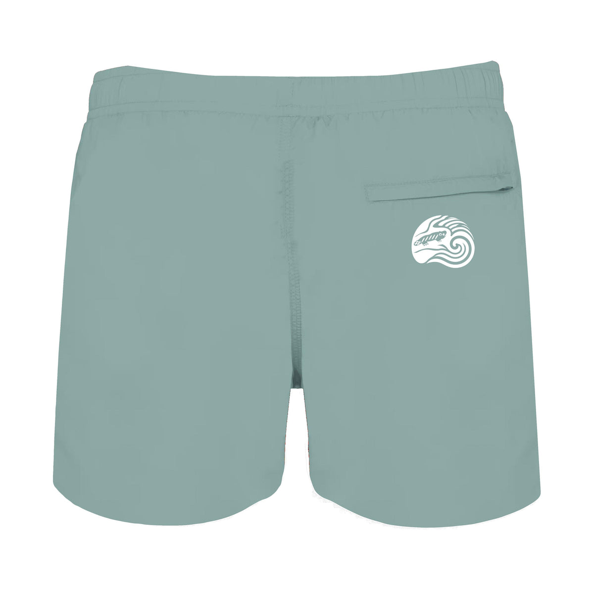 AMARA-A BS11 Small Ajolote + Text Swim Trunks WHITE - SAGE 100% polyamide. Straight cut. 2 open side pockets with mesh lining, 60 g/m², Lightweight quick-dry fabric. Back pocket with zipper, Reinforced stitching on the pockets, crotch, leg hems and back waistband. DTF logo