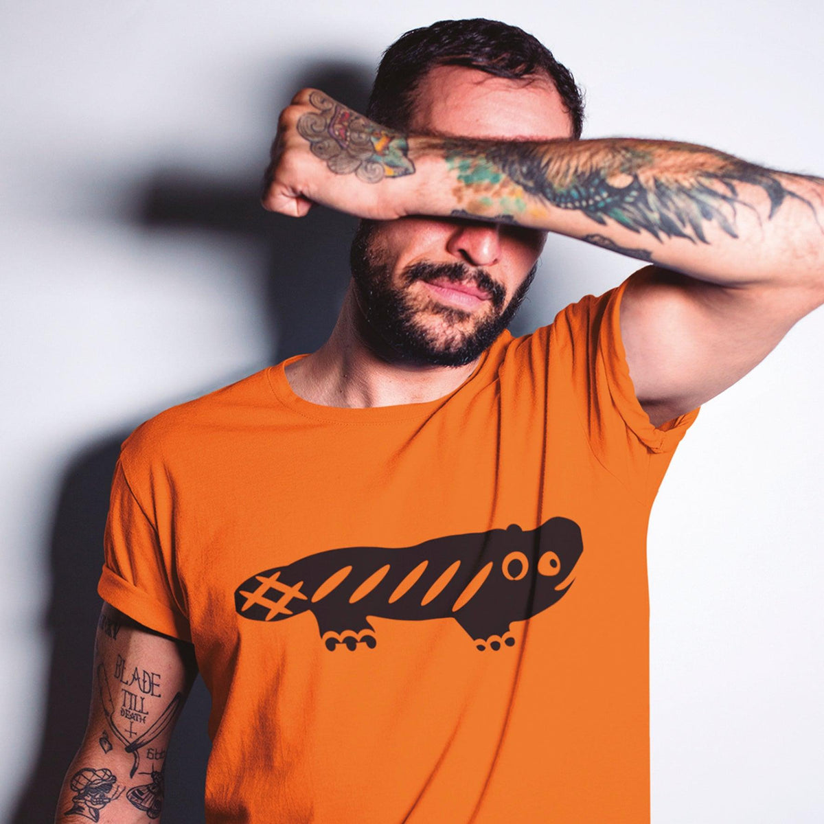 AMARA-A BS01 - T Shirt Big Ajolote BLACK - ORANGE 100% 100% Organic Cotton, 150 g/m², Seamless, Set-in sleevess, regular fit, 1x1 ribbed collar, inner binding in main fabric at neck, wide double stitching on cuffs and hems, DTF logo